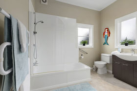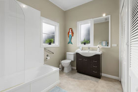 A large family bathroom includes a shower over bath, vanity, and WC, while cleverly concealed laundry and additional storage are tucked away neatly behind doors.